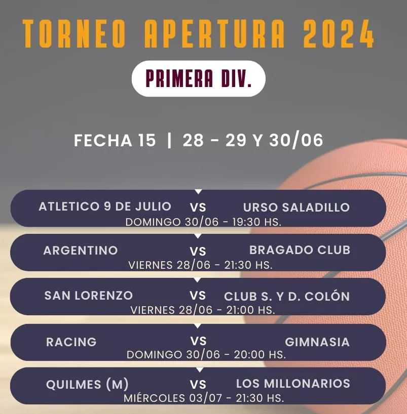 Se iniciará este viernes la decimoquinta fecha del Torneo de Primera División de Básquet. Jugaran Argentino de Chivilcoy ante Bragado club y San Lorenzo con Deportivo Colon.