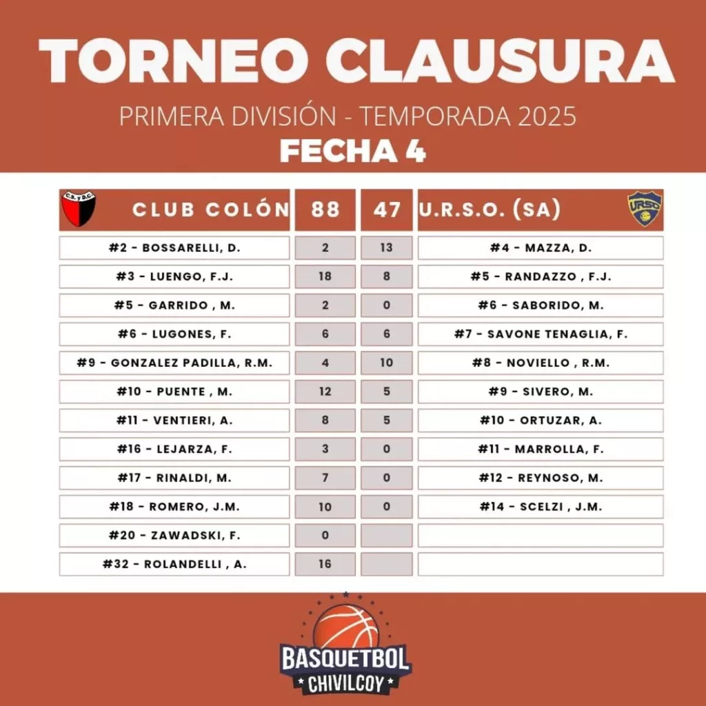 Por la cuarta fecha del Torneo de Primera División, Colon de Chivilcoy se impuso de local ante Jacobo Urso por 88 a 47. Poca resistencia pudo hacer el equipo juvenil de Saladillo ante uno de los mejores conjuntos del certamen (el otro es Racing). Lo mejor de los saladillenses pasó por Guido Mazza (13) y R. Noviello (10).