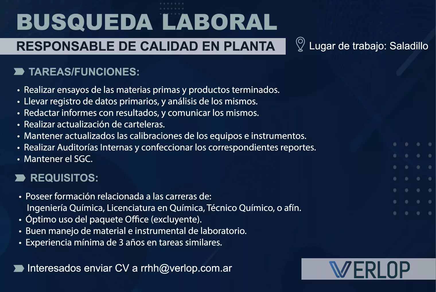 Responsable de calidad de Planta, Lugar de trabajo: Saladillo Enviar CV.: [email protected]