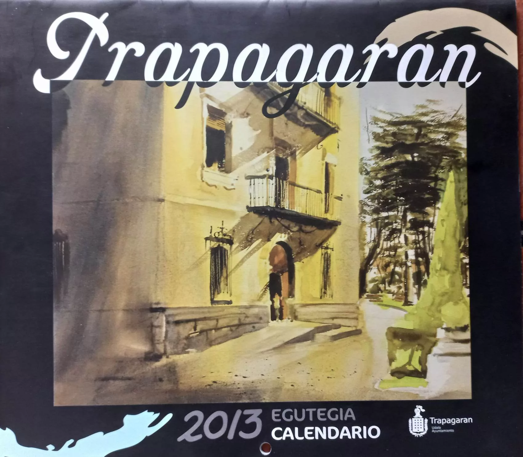Nuevamente, los paisajes y personajes de acá y de allá se reencontraron junto con los almanaques enviados desde España. El primer “Calendario” fue el de 2013, hace ya diez años; lleno de color, muestra doce pinturas de paisajes de la pueblo de “San Salvador del Valle”, pinturas al aire libre del lago de La Arboleda, el antiguo funicular y su estación, la Iglesia y la Plaza, las calles angostas que terminan en la montaña que encierra el hermoso Valle de Trápaga.