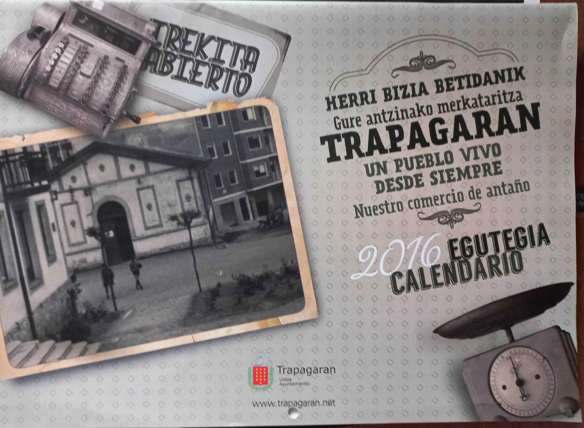 El evidente cuidado del patrimonio natural y arquitectónico se potencia en la puesta en valor de la historia y la cultura y así se viene el 2016 titulado “Trapagaran. Un pueblo vivo desde siempre. Nuestro comercio de antaño”. Cada mes se rinde homenaje a un comerciante diferente, “historia inequívoca del desarrollo de un pueblo” y espejo de su vida social: -Agarrá la libreta: -Andá hasta el almacén… “-Traé un kilo de pan” o “una docena de huevos”. Bolicheros, panaderos, bicicleteros, reposteros y tenderos, panaderos o peluqueras. Del otro lado del mar o acá, los comerciantes del barrio están nítidamente guardados en la memoria y protagonizaron ese Calendario 2016 los vecinos que apostaron en un negocio familiar.
