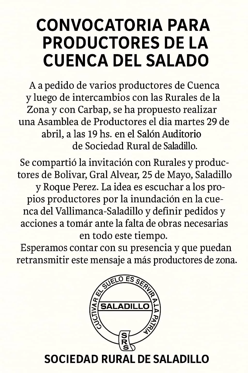 Información General Asamblea | Convocatoria para productores de la cuenta del salado abril 28, 2025 Rural-oficinas - Publicidad - Los esperamos mañana martes 29, 18:40 hs, para entrevistar a los organizadores de la Asamblea