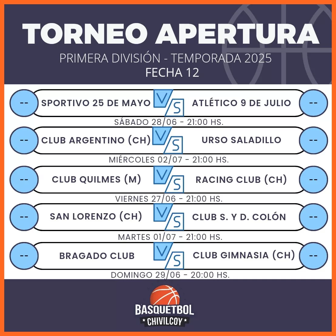 Con el partido entre Quilmes de Mercedes y Racing de Chivilcoy, arrancará este viernes la décima segunda fecha del Torneo de Básquet de Primera División.