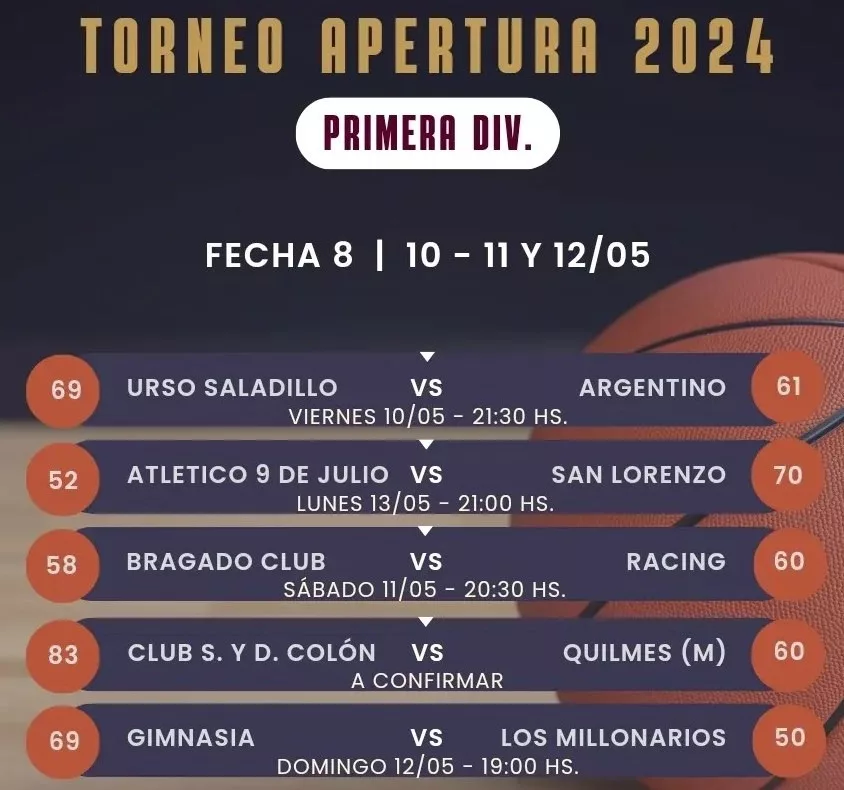 Con el partido que Colon de Chivilcoy le ganó a Quilmes de Mercedes por 83 a 60, se cerró la octava fecha del Torneo de Primera División de Basquetbol. En cuanto al equipo del club Jacobo Urso, recordemos que volvió al triunfo, luego de ganarle el último viernes al club Argentino de Chivilcoy, 69 a 61