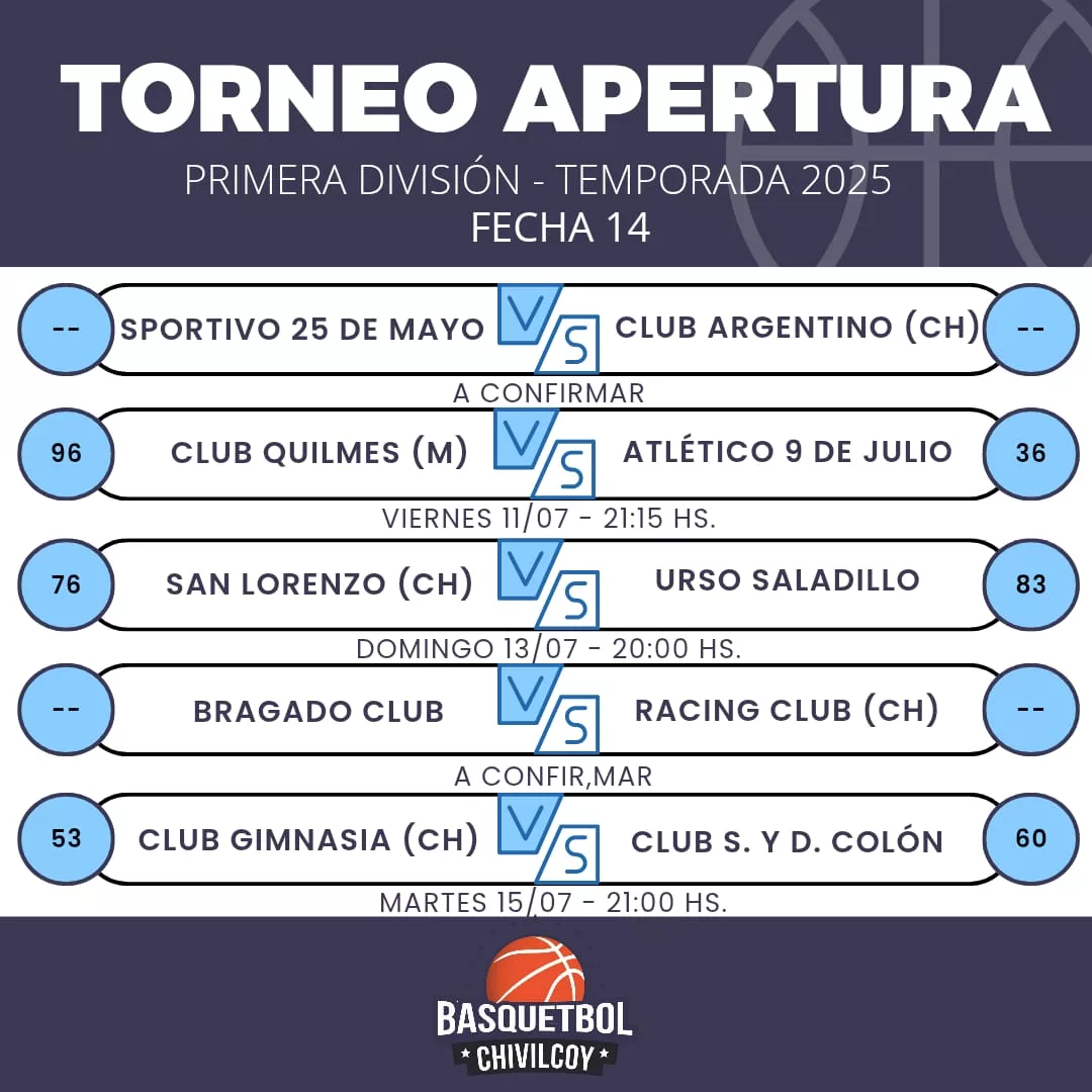 Por la fecha 14 del Torneo Apertura 2025 de Primera División de Básquet, Jacobo Urso le ganó en calidad de visitante a San Lorenzo de Chivilcoy por 83 a 76. Por la misma jornada Gimnasia perdió ante Colon por 60 a 53, mientras que Quilmes de Mercedes apabulló al club Atlético Nueve de Julio con un marcador de 96 a 36.