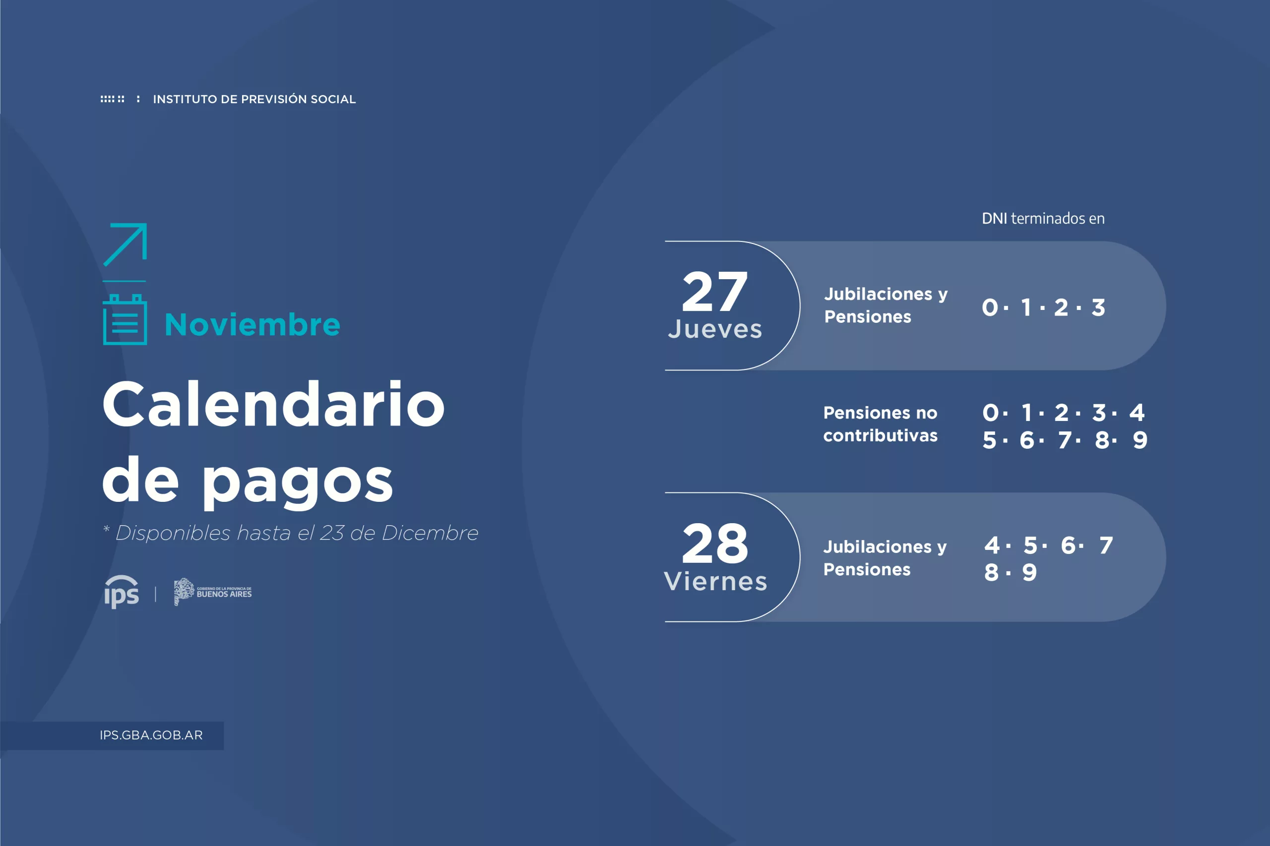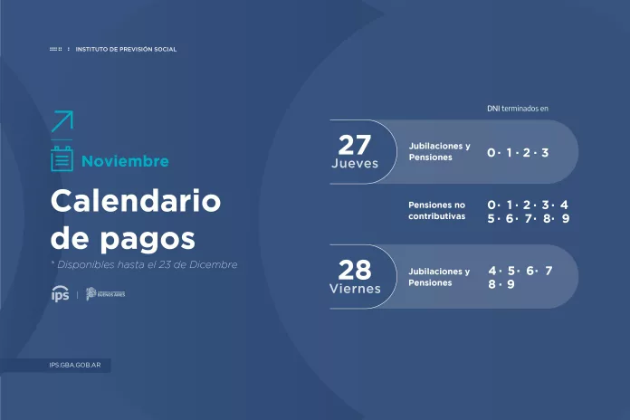 El Instituto de Previsión Social (IPS) informa que, hoy jueves 27, se inicia el calendario de pagos de los haberes de noviembre, para las personas jubiladas y pensionadas de la provincia de Buenos Aires, según cronograma que se detalla a continuación: