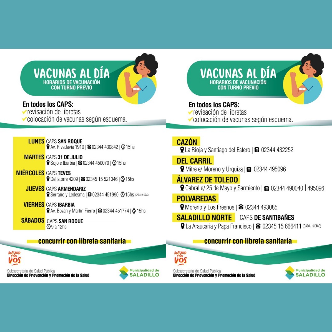 La vacunación constituye un eje central para la prevención de enfermedades en nuestra sociedad. Es por ello que sostenemos los espacios de vacunación gratuitos en todos los CAPS de Saladillo, favoreciendo el acceso a las mismas en cada rincón de la ciudad.