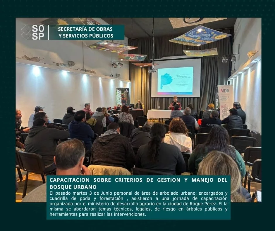 El pasado martes 3 de Junio personal de área de arbolado urbano; encargados y cuadrilla de poda y forestación, asistieron a una jornada de capacitación organizada por el ministerio de desarrollo agrario en la ciudad de Roque Pérez. En la misma se abordaron temas técnicos, legales, de riesgo en árboles públicos y herramientas para realizar las intervenciones