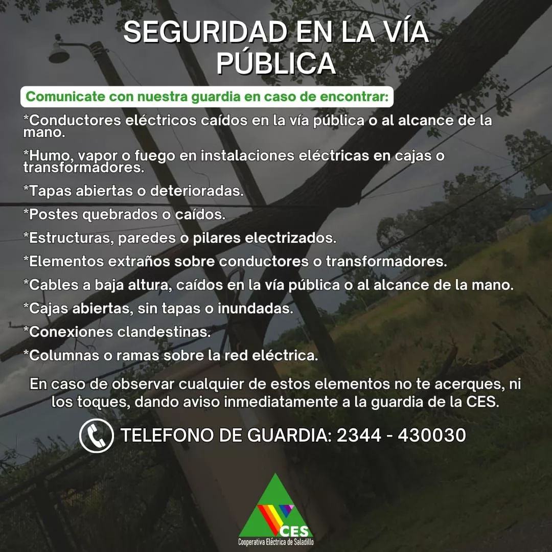 CES ENERGÍA informa que el servicio general se encuentra en normal funcionamiento tras el temporal que afecta al Partido de Saladillo. No obstante se sugiere transitar con precaución y advertir a la guardia cualquier anomalía sobre las líneas de distribución.