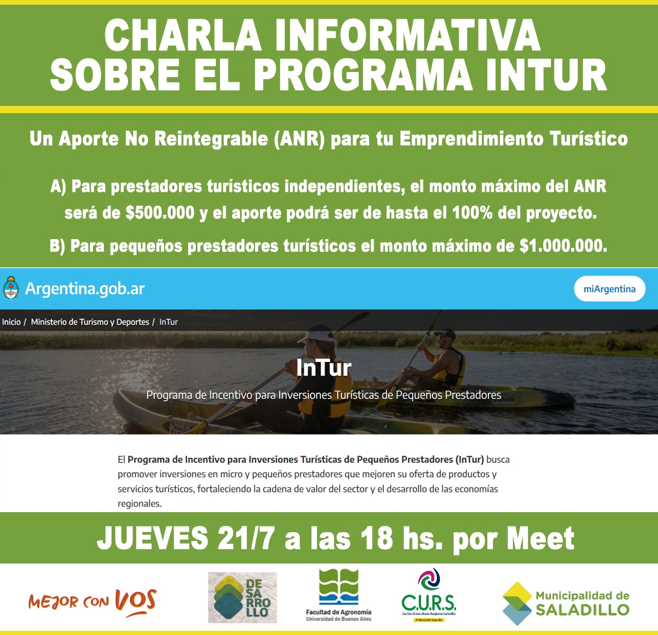 La Facultad de Agronomía de la UBA, el Centro Universitario Regional de Saladillo, la Dirección de Turismo y la Secretaría de Desarrollo Local invitan a participar de la charla informativa sobre el Programa In-Tur, que se desarrollará vía Meet el Jueves 21/7 a las 18 hs.