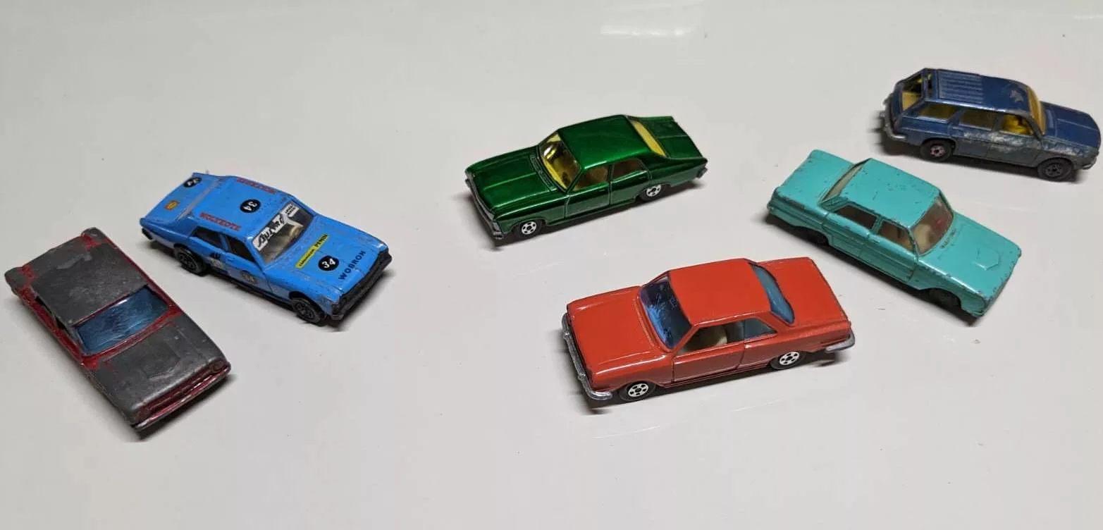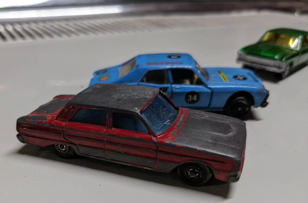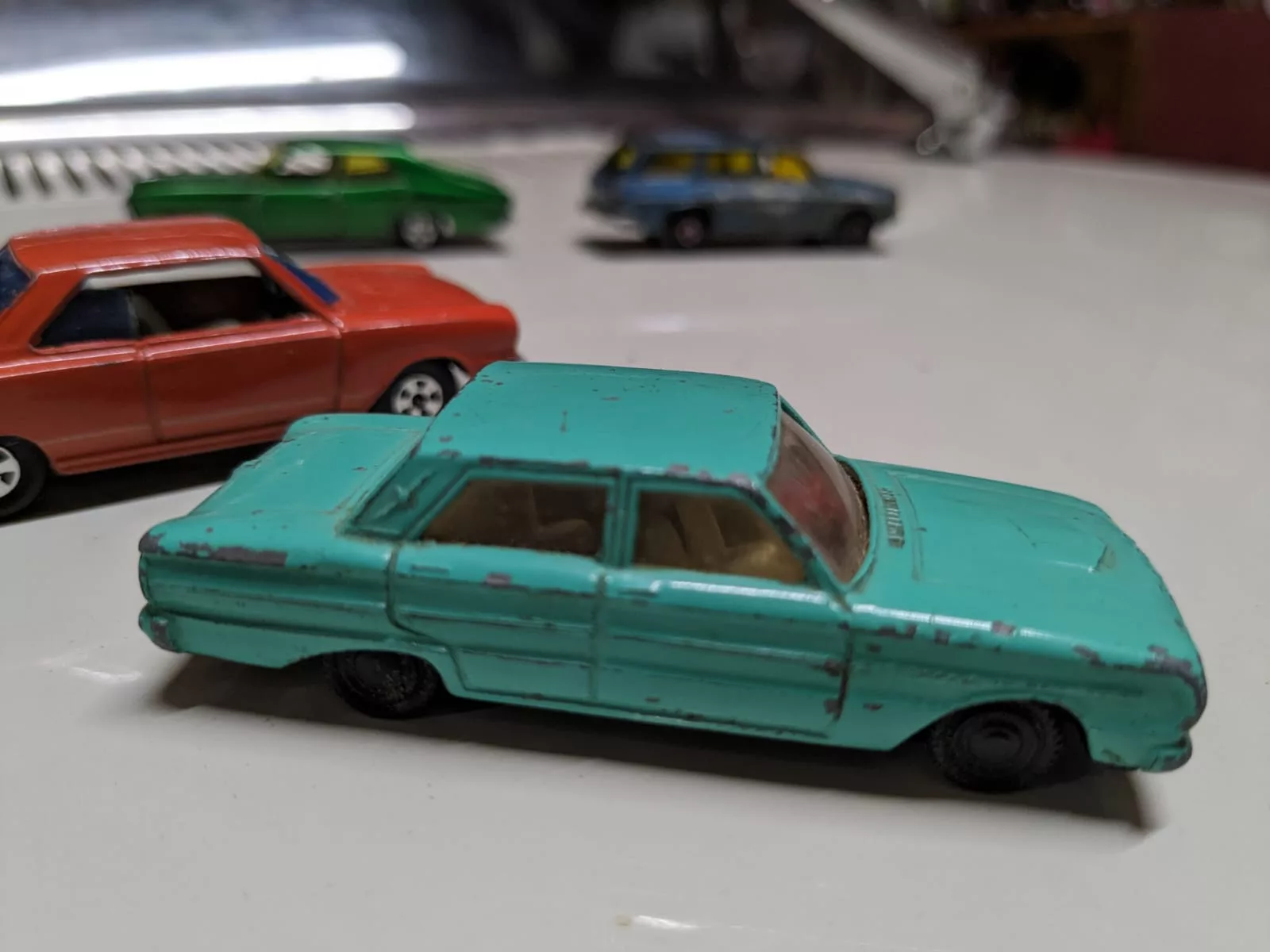 “En esta segunda entrega, nada mas maravilloso que mostrar modelos originales que fueron parte de mi infancia y un par jugados por el querido amigo Mario Chicare, que hoy descansan en mi humilde museo. Un Ford Falcon, verde agua, que recuerdo como si fuera hoy, era uno de mis preferidos y se encuentra en un estado impecable a pesar de haber pasado más de 50 años. Después dos increíbles modelos, sin jugar, 0km. Una hermosa Chevy y un Torino. La historia de la adquisición de estos modelos me traslada al 2001, cuando acompañe a un equipo de básquet donde jugaba mi hijo a Goya, Corrientes. En una caminata por los alrededores del estadio, me los encontré en la vidriera de un kiosco, con sus cajas originales y ahí nomás fui a su encuentro y descansan en la vitrina de los preferidos.