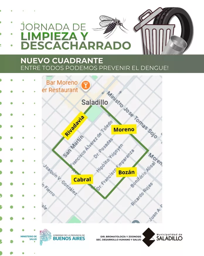 La Dirección de Bromatología y Zoonosis de la Municipalidad de Saladillo informa a la comunidad que, a partir del jueves 20 de noviembre, comenzará la segunda etapa de la Jornada de Limpieza y Descacharrado en el cuadrante comprendido entre las calles Rivadavia, Bozán, Cabral y Moreno, junto a promotoras/es comunitarias/os de la Provincia de Buenos Aires.