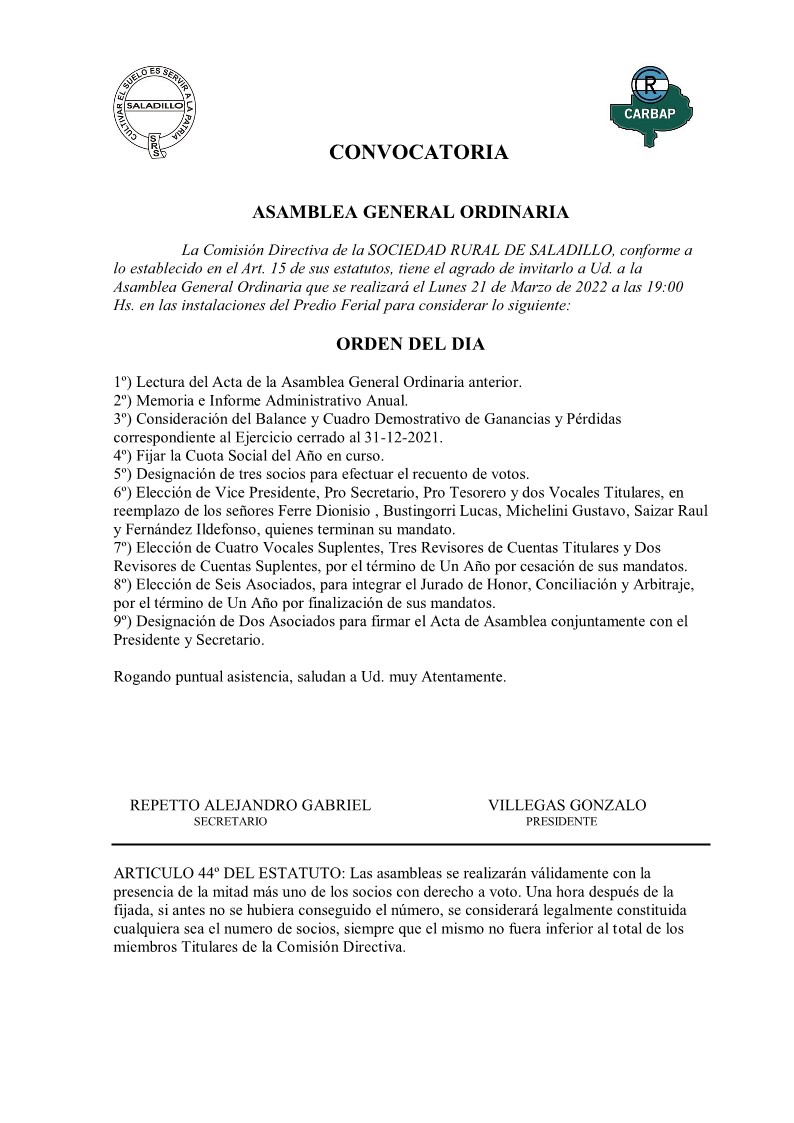 Información General Convocatoria a la asamblea en la sociedad rural de Saladillo febrero 21, 2022 - Publicidad - Se realizará la Asamblea General Ordinaria en la sociedad Rural de Saladillo, que tendrá lugar el día lunes 21 de Marzo a las 19 hs en la oficina de nuestro predio Ferial.