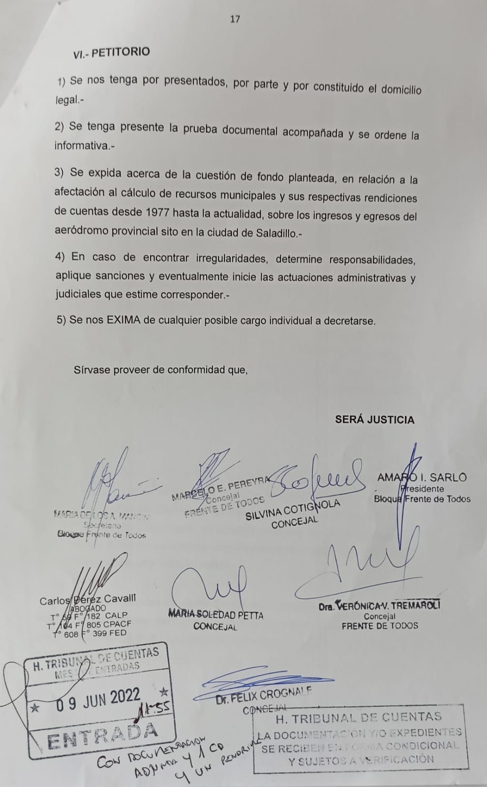 Motivados en la ausencia de rendición de lo recaudado en el Aeródromo Provincial y del destino que tuvieron esos recursos, los Concejales opositores decidieron dar un paso más en la investigación y búsqueda de transparencia del tema.