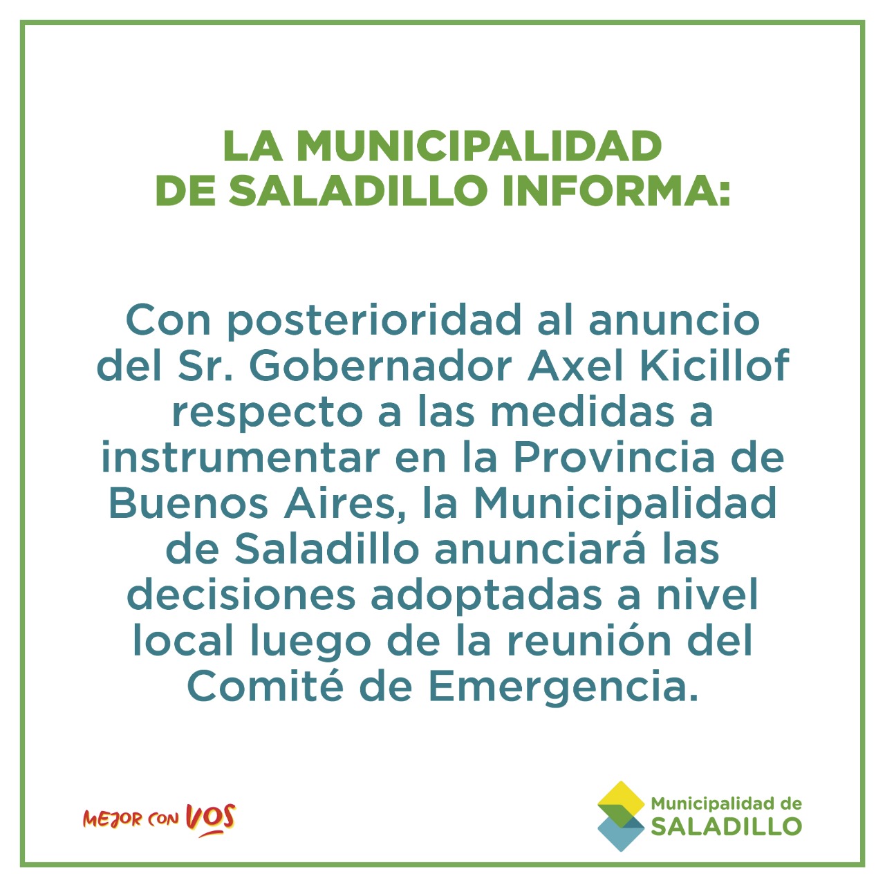 Con posterioridad al anuncio del Sr. Gobernador Axel Kicillof respecto a las medidas a instrumentar en la Provincia de Buenos Aires, la Municipalidad de Saladillo anunciará las decisiones adoptadas a nivel local luego de la reunión del Comité de Emergencia.