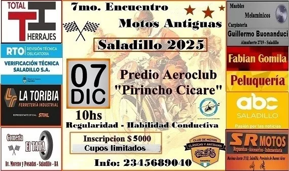 Organizado por el club de Motos Clásicas y Antiguas de Saladillo, se llevará a cabo el domingo 7 de diciembre el Séptimo Encuentro y Rally de Motos Antiguas. El mismo tendrá como base el Aeroclub Augusto Cicaré de Saladillo y será con entrada libre y gratuita.