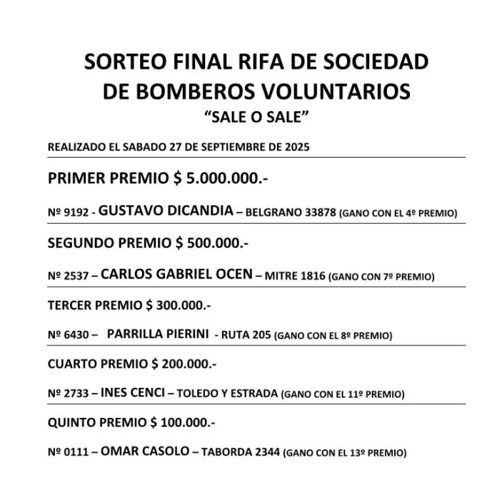 Entrega de premios del sorteo realizado por la sociedad de Bomberos Voluntarios