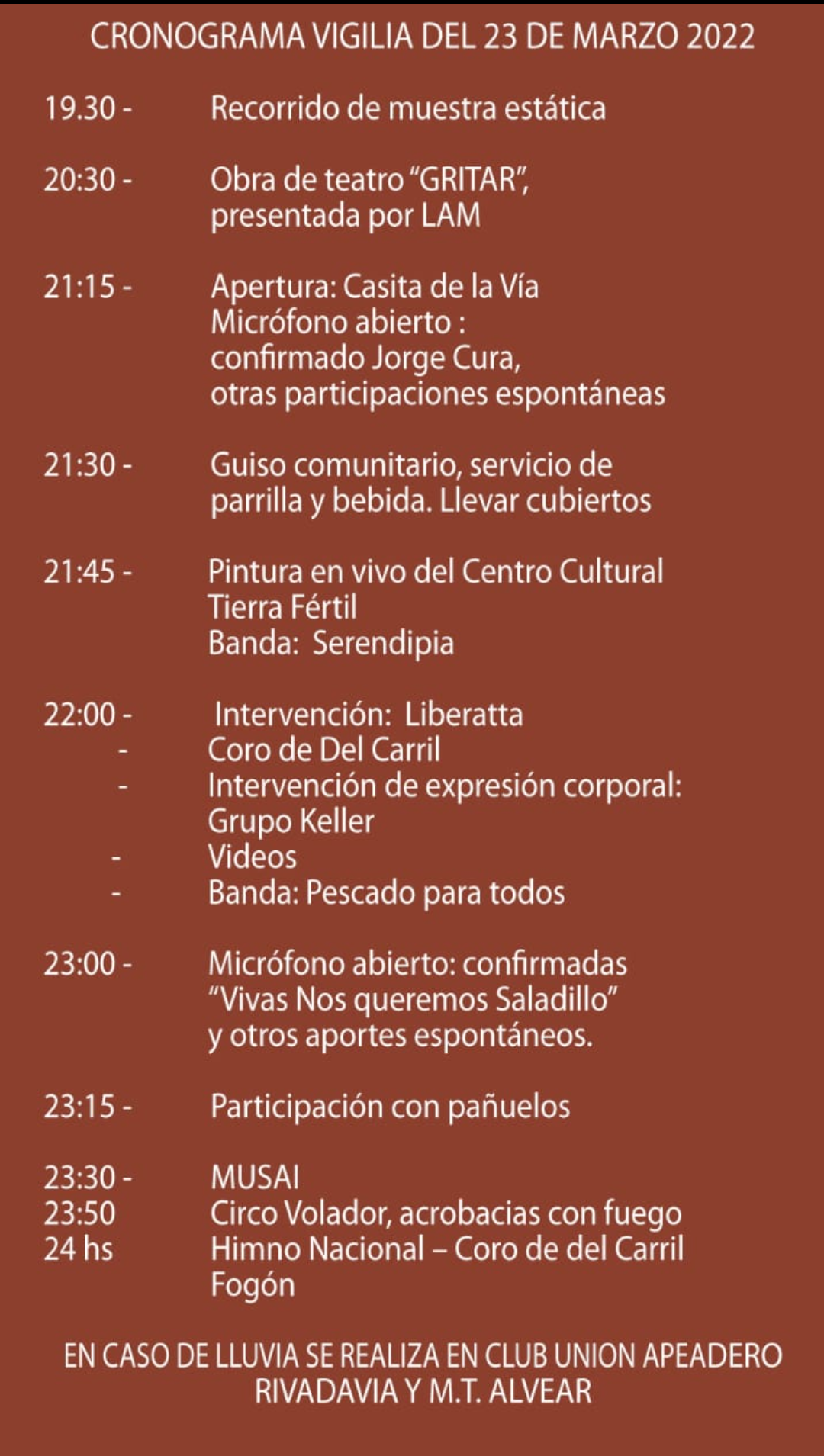Antes de la pandemia, cada año, las organizaciones sociales y artísticas de Saladillo, pensaban y diseñaban de un modo colectivo y respetuoso la vigilia itinerante. En el 2019 Casita de la Vía había ofrecido su espacio y coordinación para la vigilia. Con la llegada de la pandemia, fue imposible realizarla, por lo que se retomó este año con la misma organización.