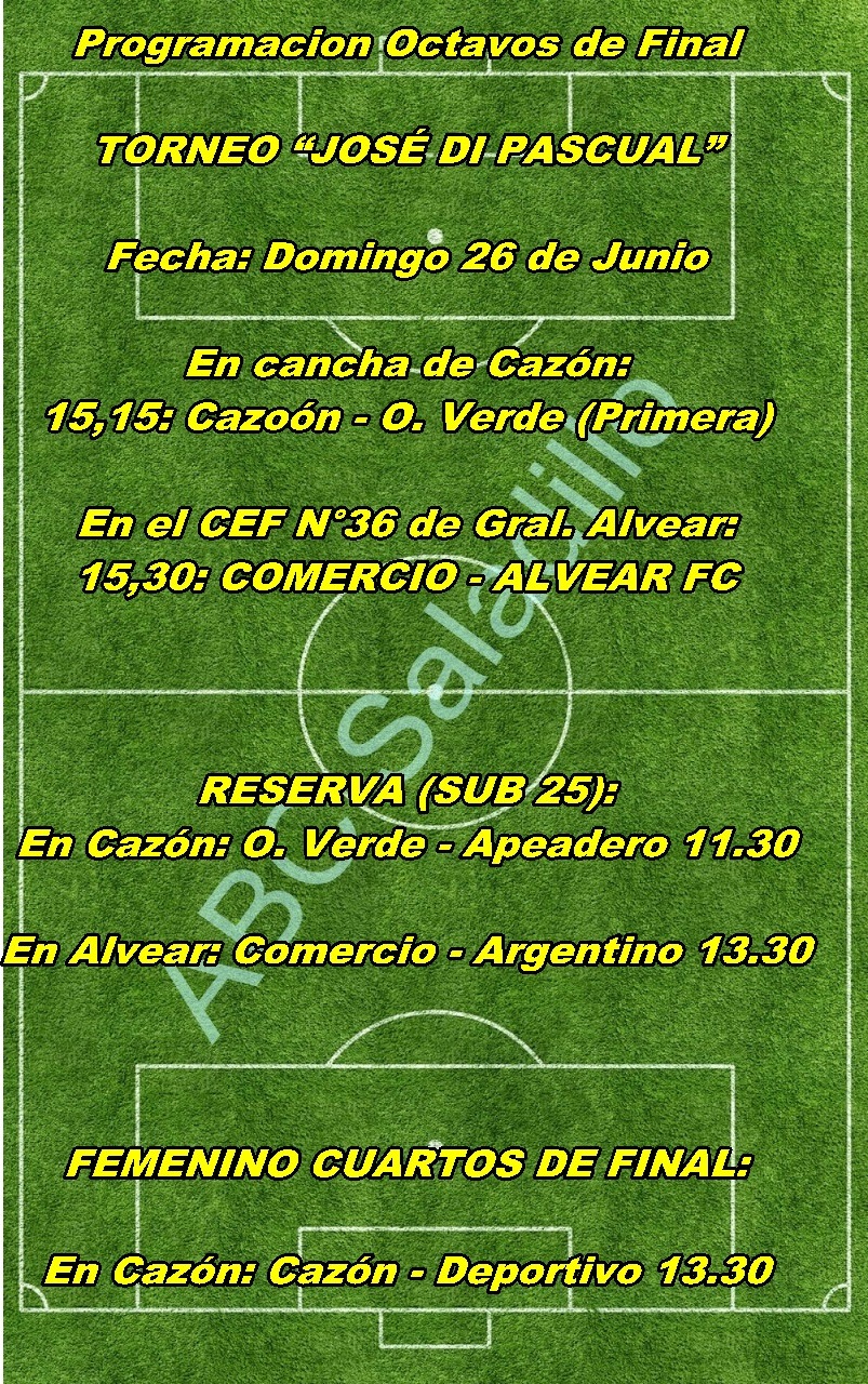 En la localidad de los “Viveros”, el Deportivo Cazón recibirá en su estadio a Oro Verde en primera división en lo que será el primer cruce de octavos, buscando un lugar a cuartos de final. La definición será a un solo partido, teniendo la localia Cazón por haber clasificado arriba de Oro Verde. La jornada se iniciará desde las 11,30 con el cruce en Reserva entre Apeadero y Oro Verde. Luego desde las 13,30 por cuartos de final del Torneo Femenino se medirán Cazón y Deportivo Alvear, mientras que el plato fuerte de la tarde será a partir de las 15,15 cuando se enfrenten Cazón y Oro Verde en la divisional mayor.