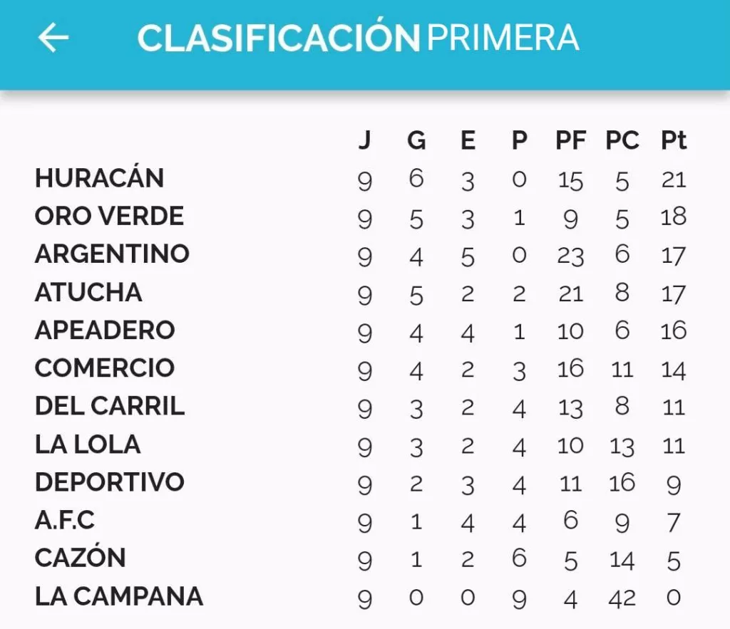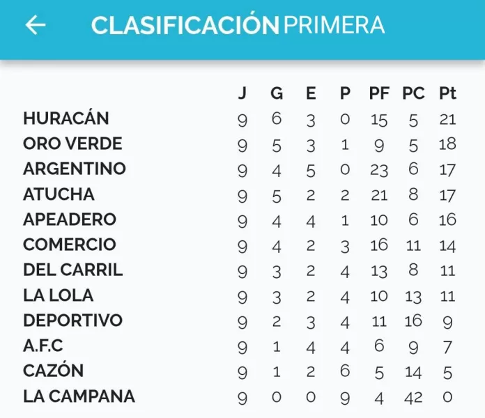 Se desarrolló este domingo la novena fecha del Torneo de Primera División. Huracán se quedó con el clásico ante Unión Apeadero por 2 a 0, para mantener el liderazgo en el certamen mayor. Por su parte, Oro Verde, consiguió un importante triunfo ante Defensores de Atucha por la mínima diferencia y se ubica como escolta luego de nueve fechas. En tanto Argentino, goleó por la abultada cifra de 11 a 1 al club La Campana.