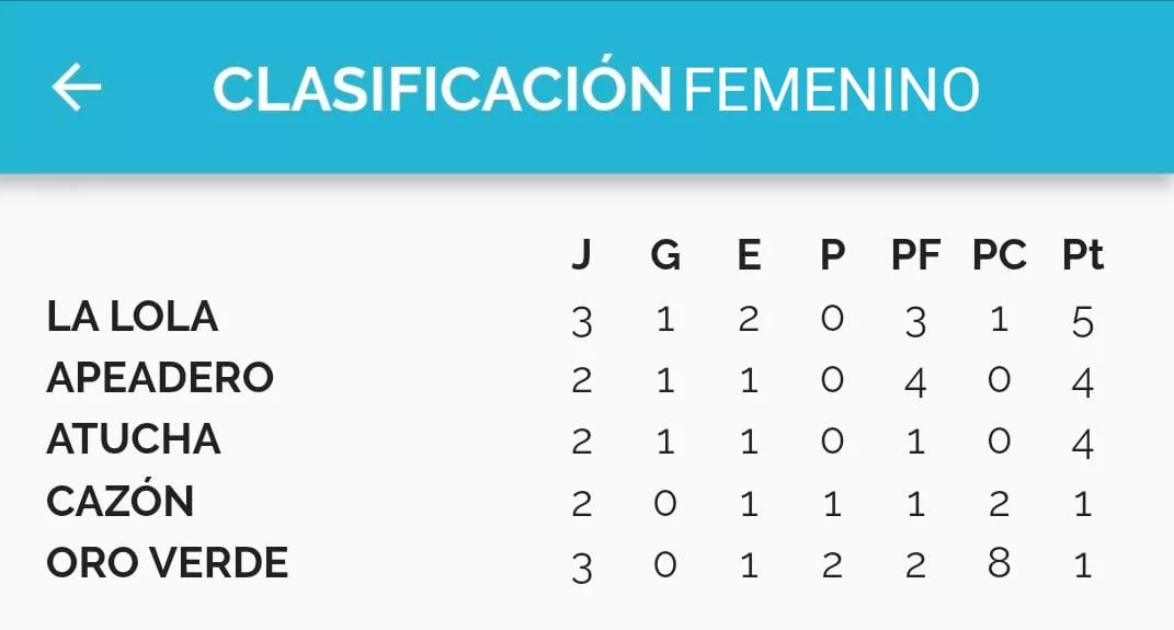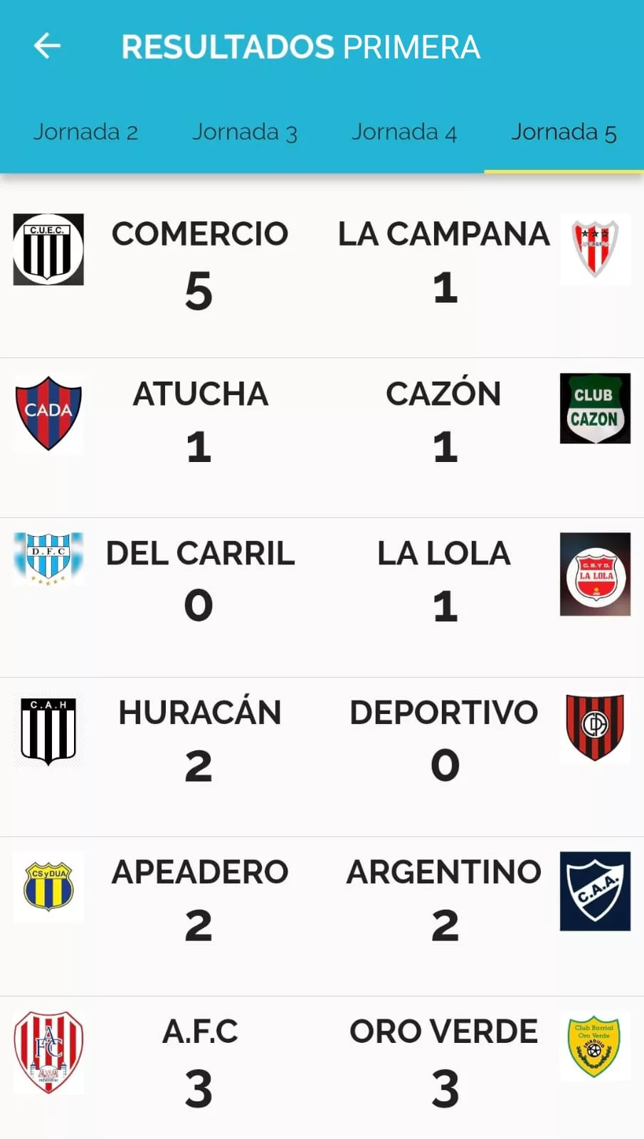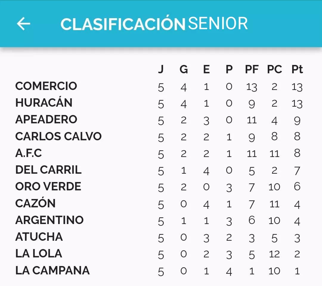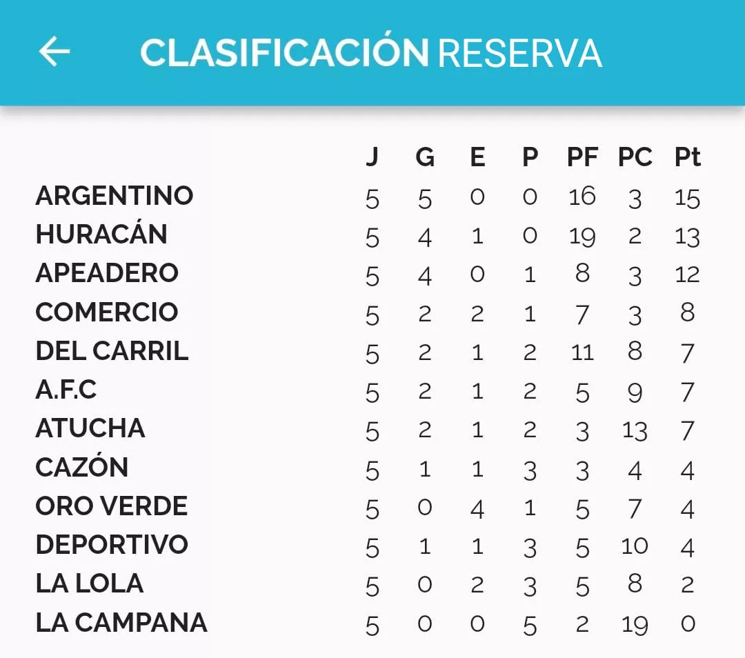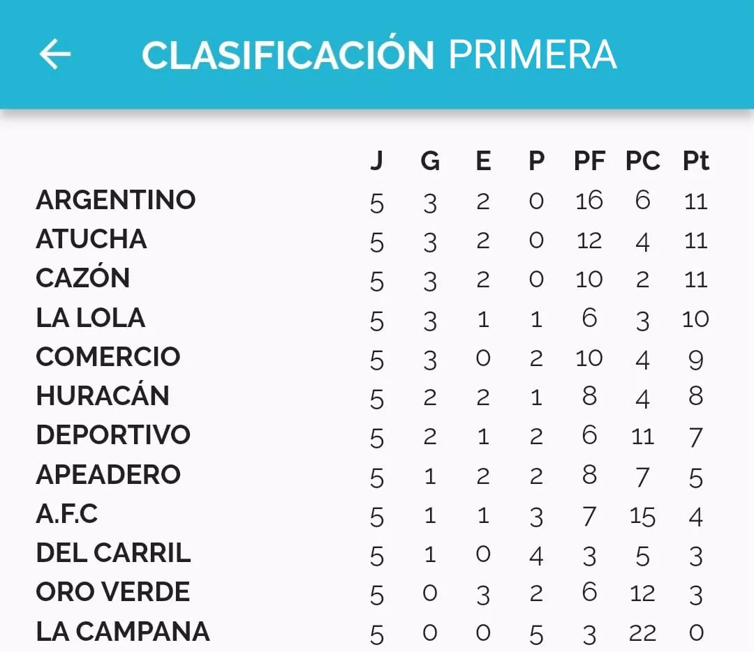 📝Se desarrolló este domingo la quinta fecha del Torneo Apertura para las categorías mayores. Luego de los resultados, la tabla en primera división la encabezan Argentino, Atucha y Cazón con 11 puntos, acomodándose bien luego de esta fecha, La Lola con 10 unidades.