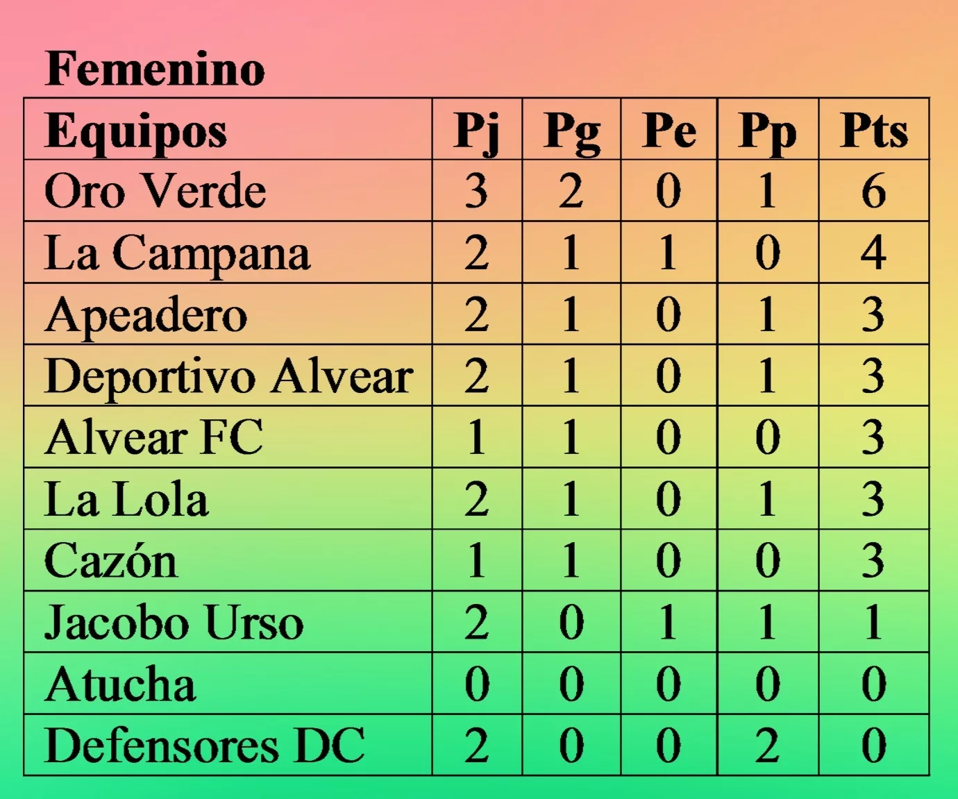 Se disputaron el domingo último algunos encuentros de fútbol del Torneo Femenino de Primera división, donde se registraron los triunfos del Deportivo Cazón y Oro Verde, más el empate entre Urso y La Campana. Se adjunta tabla de posiciones.
