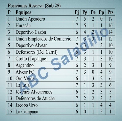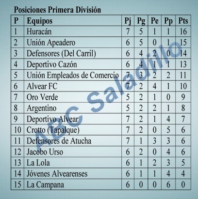 Se desarrolló este domingo la séptima fecha del Torneo Apertura de Primera División. En el Adolfo Canteli, Argentino le ganó 1/0 a La Lola. Andrés Rey marró un penal para el local. En el estadio de Rivadavia Sur, Defensores d Del Carril consiguió un importante triunfo ante Huracan por 2/0 y además le cortó el invicto al puntero del certamen. En la localidad de los Viveros, Deportivo Cazón derroto a Crotto de Tapalque por 2 a 1.