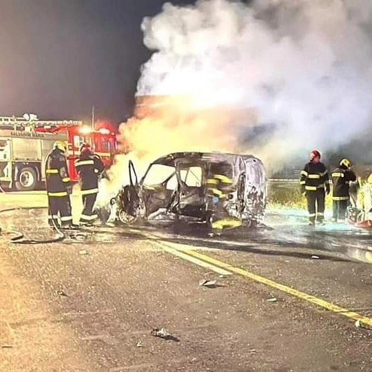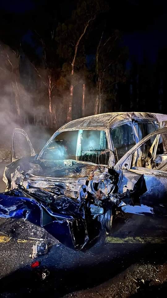 Como consecuencia del choque, el utilitario se incendió y quedó sobre la ruta quedó, mientras que en la banquina sentido Lobos estaba el Ford Ka volcado y en la banquina contraria la Duster, con el conductor fallecido.