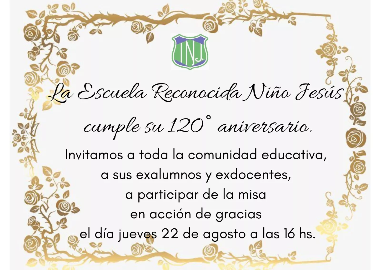 Información General La Escuela Reconocida Niño Jesús tiene el honor de invitar a la comunidad educativa, exalumnos/as y exdocentes a la misa de acción de gracias, en conmemoración del 120º aniversario del nivel primario agosto 21, 2024 - Publicidad -