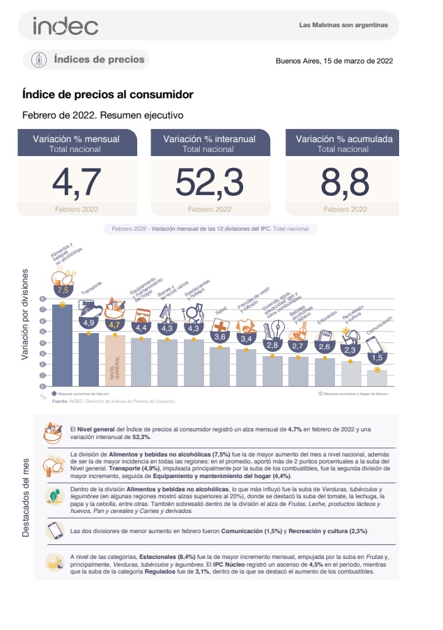 El Nivel general del Índice de precios al consumidor registró un alza mensual de 4,7% en febrero de 2022 y una