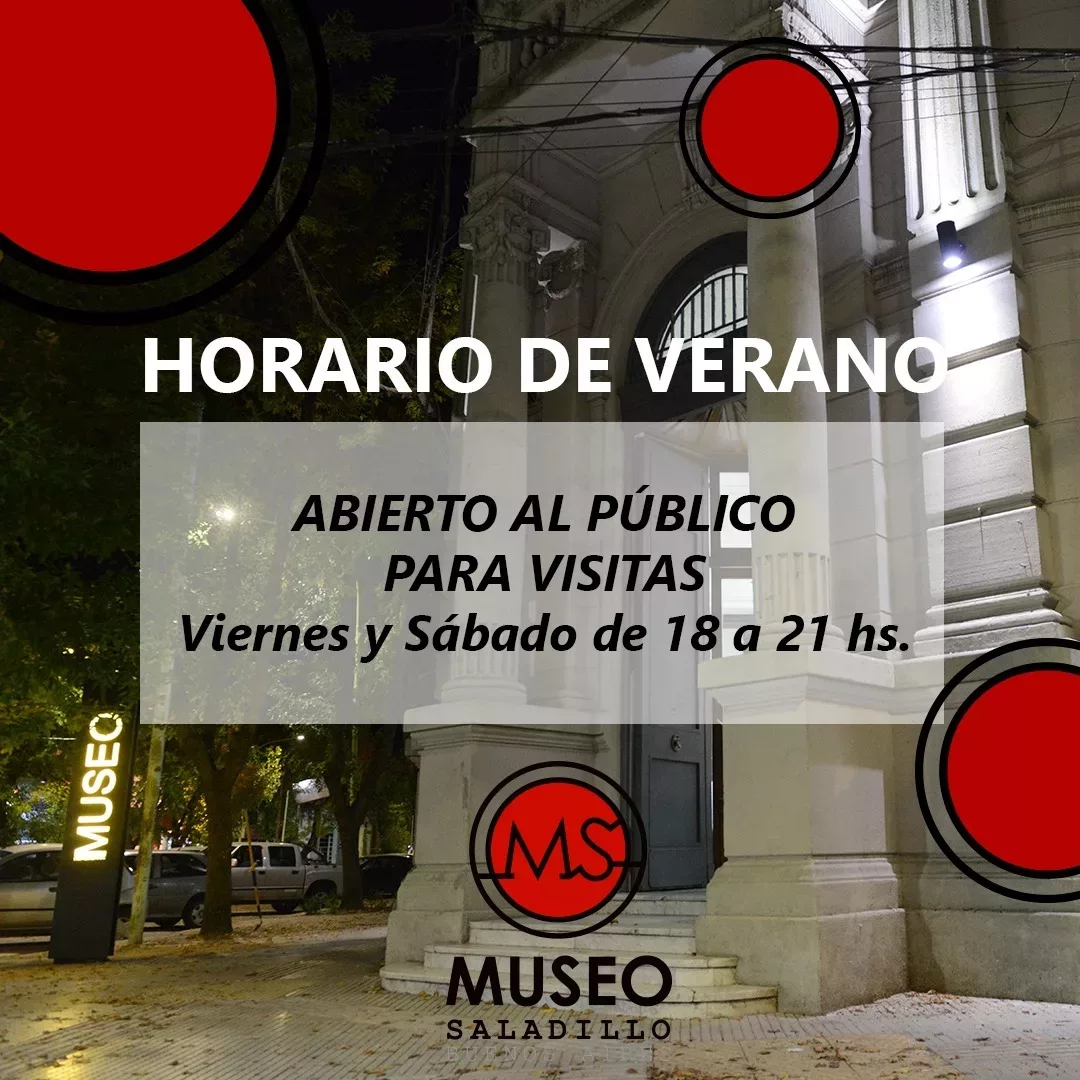 Información General Nuevo horario del museo de Saladillo diciembre 5, 2023 - Publicidad - HORARIO DE VERANO DEL MUSEO SALADILLO El Museo Saladillo abrirá para visitas al público los viernes y sábados de 18 a 21 horas.