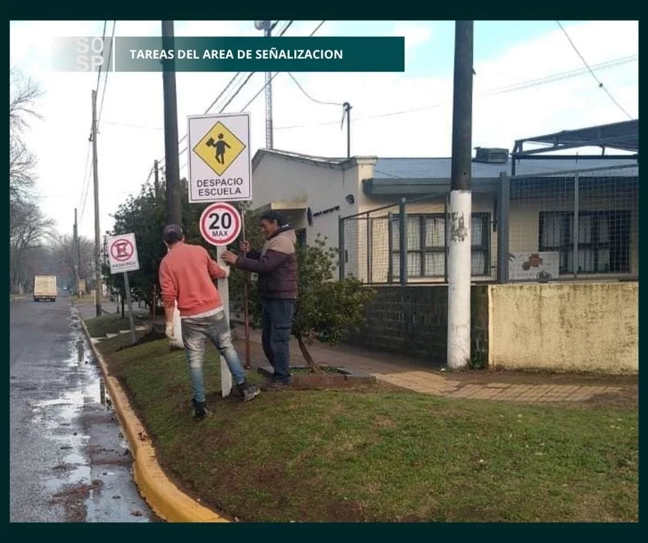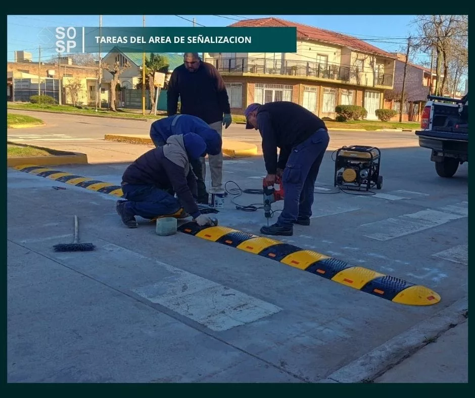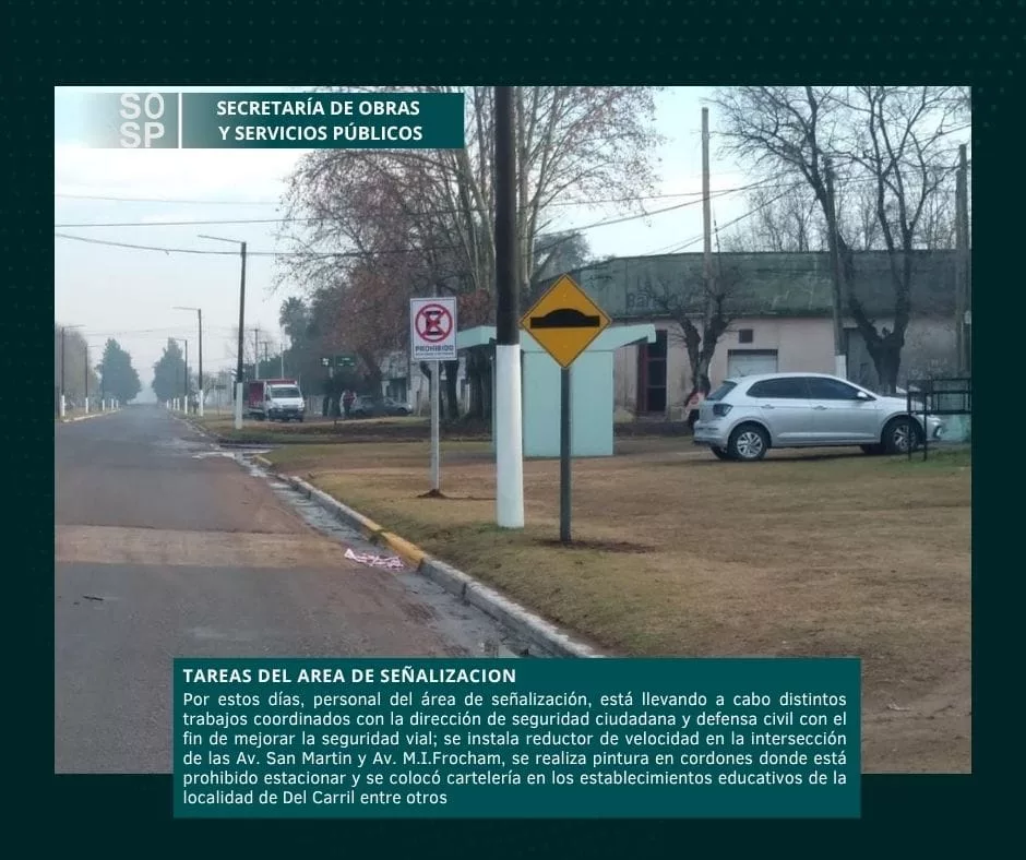 Por estos días, personal del área de señalización, está llevando a cabo distintos trabajos coordinados con la dirección de seguridad ciudadana y defensa civil con el fin de mejorar la seguridad vial; se instala reductor de velocidad en la intersección de las Av. San Martín y Av. M. I. Frocham, se realiza pintura en cordones donde está prohibido estacionar y se colocó cartelería en los establecimientos educativos de la localidad de Del Carril entre otros.
