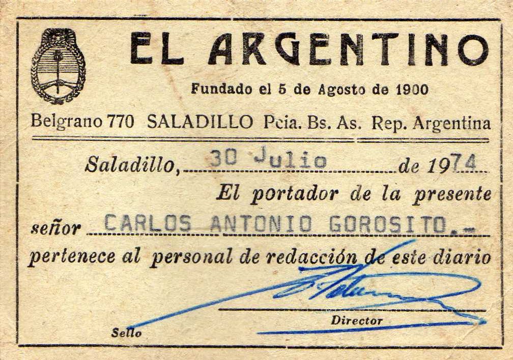 “Al 31 de julio de 1974 yo tenía 19 años y estaba cursando el quinto año en la Sección Perito Mercantil del Ex Colegio Nacional Anexo Comercial “Manuel Pardal a fin de año en diciembre cumplía 20 años. Yo no había empezado la escuela primaria a las 6 años como lo hacían todos, me enviaron a partir de los 8 años, en otro momento comentaré los motivos por los cuales fue así. Saladillo celebraba ese 31 de julio el 111 aniversario de la fundación de la ciudad. Yo era presidente del Club Estudiantil del Colegio Nacional, el Intendente Municipal era Ariel Horacio Delia del Partido Justicialista. En esa época empezó una amistad con el Intendente de entonces que duró hasta que el ex Intendente falleció el 17 de julio de 2014. El 31 de julio de hace 47 años atrás visitó la ciudad de Saladillo el entonces Gobernador de la Provincia de Bs.As Señor Victorio Calabró que presidió el desfile cívico-militar que se realizó. Los Diputados saladillenses eran Tomás Lissalde (Partido Justicialista) y el Ing. Julio Fernando Volonté (UCR). Yo era además colaborador del Ing. Volonté en su actividad política. Volonté también era Director del semanario El Argentino y yo colaboraba como cronista. En el periodo 1973-1976 las sesiones del Honorable Concejo Deliberante se realizaban los días lunes. Yo concurría junto a Fernando (así lo llamábamos a Volonté). De martes a jueves inclusive el Ing. Volonté desarrollaba sus actividades legislativas en la ciudad de La Plata y me dejaba instrucciones para reunir información periodística que luego el procesaría para elaborar sus artículos. El martes 30 de julio de 1974 el entonces Diputado Provincial y Director del Semanario El Argentino me otorgó una nueva credencial dado que yo había perdido o deteriorado la otorgada en 1973. Yo debía participar como alumno del ex Colegio Nacional de nuestra ciudad en el desfile pero le pedí al Rector del Colegio Dr. Julio Morena un permiso especial para que me permitiera ser uno de los cronistas del nuevo aniversario de la fundación de la ciudad de Saladillo,el que me fue concedido. Por lo tanto hace 47 años atrás el miércoles 31 de julio de 1974 compartí el palco con las autoridades presididas por el Gobernador Calabró y el Intendente Delia. Siempre recuerdo con afecto el haber sido cronista del 111 aniversario de la fundación de nuestra querida ciudad. Que este recuerdo personal en las vísperas del 158 aniversario de la fundación de Saladillo Ciudad sirva también para recordar el aporte que hicieron a la Democracia el Ing. Julio Fernando Volonté y el ex Intendente Ariel Horacio Delia”. Carlos Antonio Gorosito. Ex – Intendente Municipal (1991-2015), Saladillo 30 de julio de 2021.