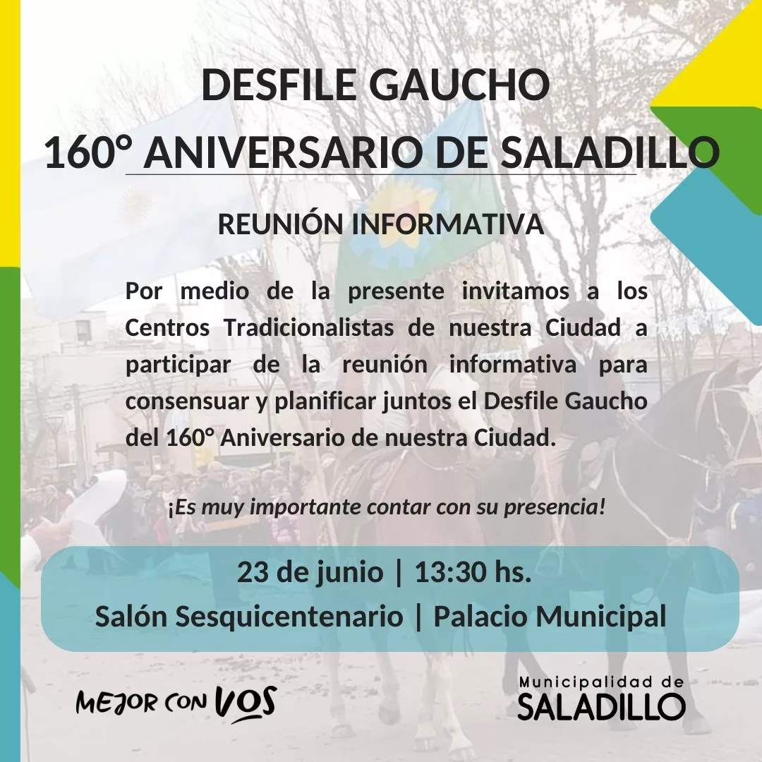 Por medio de la presente, invitamos a los Centros Tradicionalistas de nuestra ciudad a participar de la reunión informativa para consensuar y planificar juntos el Desfile Gaucho del 160° Aniversario de nuestra ciudad.
