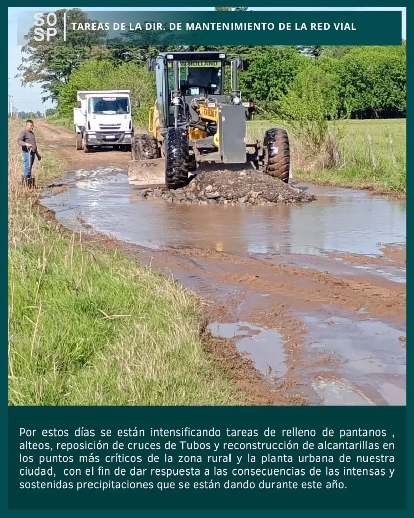 Por estos días se están intensificando tareas de relleno de pantanos, alteos, reposición de cruces de Tubos y reconstrucción de alcantarillas en los puntos más críticos de la zona rural y la planta urbana de nuestra ciudad, con el fin de dar respuesta a las consecuencias de las intensas y sostenidas precipitaciones que se están dando durante este año.