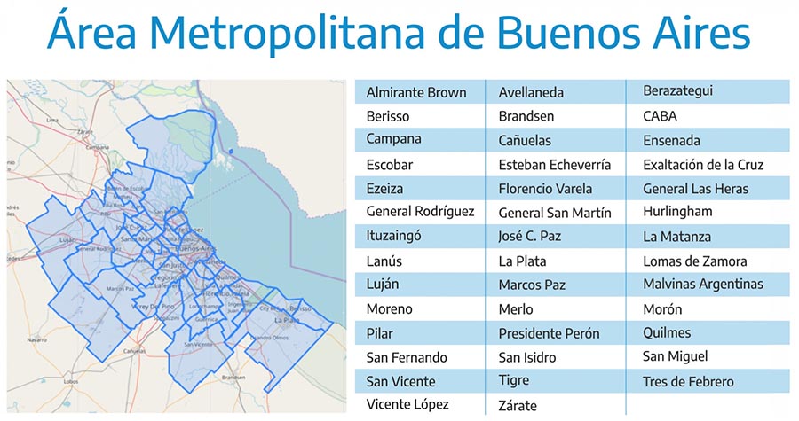 Esos 35 partidos en cuestión son: Almirante Brown, Avellaneda, Berazategui, Berisso, Ensenada, Escobar, Esteban Echeverría, Ezeiza, Florencio Varela, General Las Heras, General Rodríguez, General San Martín, Hurlingham, Ituzaingó, José C. Paz, La Matanza, Lanús, La Plata, Lomas de Zamora, Luján, Marcos Paz, Malvinas Argentinas, Moreno, Merlo, Morón, Pilar, Presidente Perón, Quilmes, San Fernando, San Isidro, San Miguel, San Vicente, Tigre, Tres de Febrero y Vicente López.
