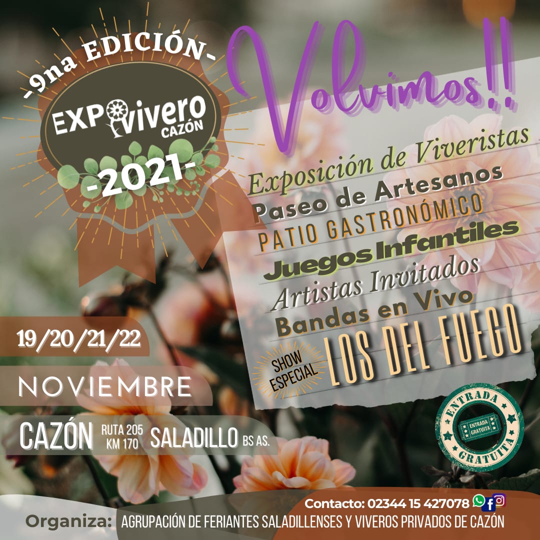Desde el viernes 19 hasta el lunes 22 de noviembre, se estará desarrollando en Cazón, la Expo Vivero 2021, para la cual se espera un gran marco de público luego de haberse suspendido por la pandemia.