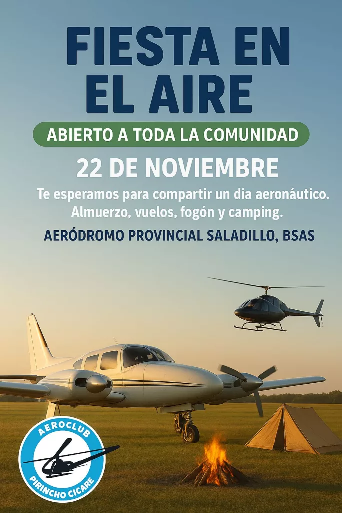Este sábado 22 de noviembre tendrá lugar, en el Aeródromo de Saladillo, una nueva y atractiva jornada de encuentro aeronáutico. El Aeroclub Pirincho Cicaré, junto con la Coordinación Municipal del Aeródromo, invita a participar de este nuevo evento aeronáutico con entrada libre y gratuita, que ofrecerá demostraciones estáticas y dinámicas de distintos tipos de aeronaves y disciplinas aeronáuticas.