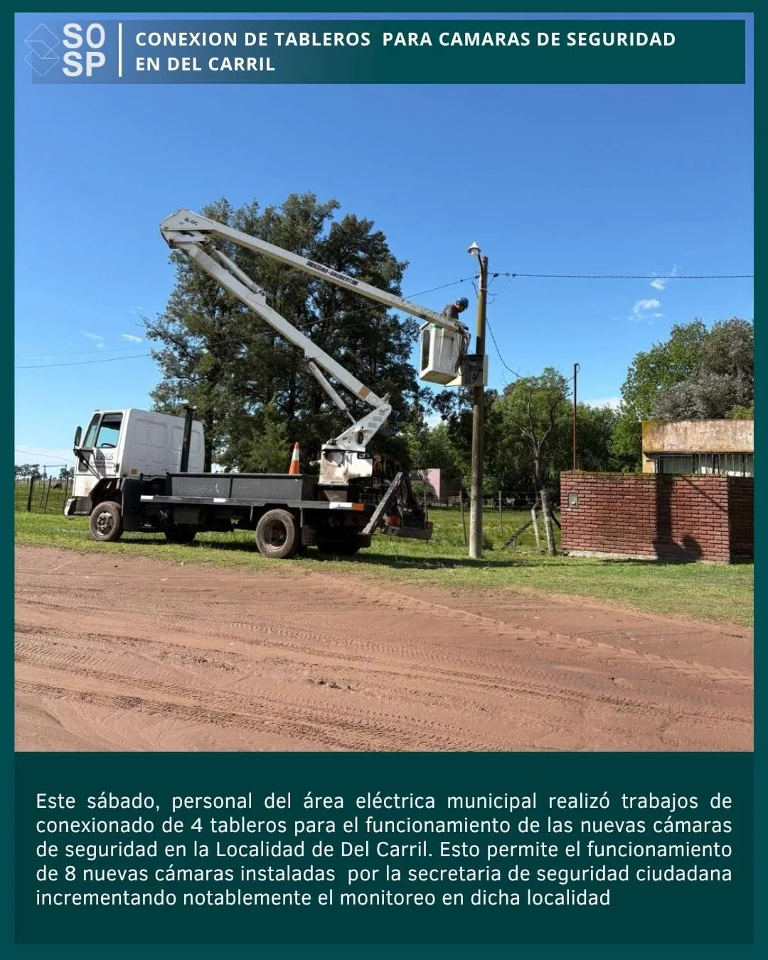 Este sábado, personal del área eléctrica municipal realizó trabajos de conexionado de 4 tableros para el funcionamiento de las nuevas cámaras de seguridad en la Localidad de Del Carril. Esto permite el funcionamiento de 8 nuevas cámaras instaladas por la secretaria de seguridad ciudadana incrementando notablemente el monitoreo en dicha localidad.