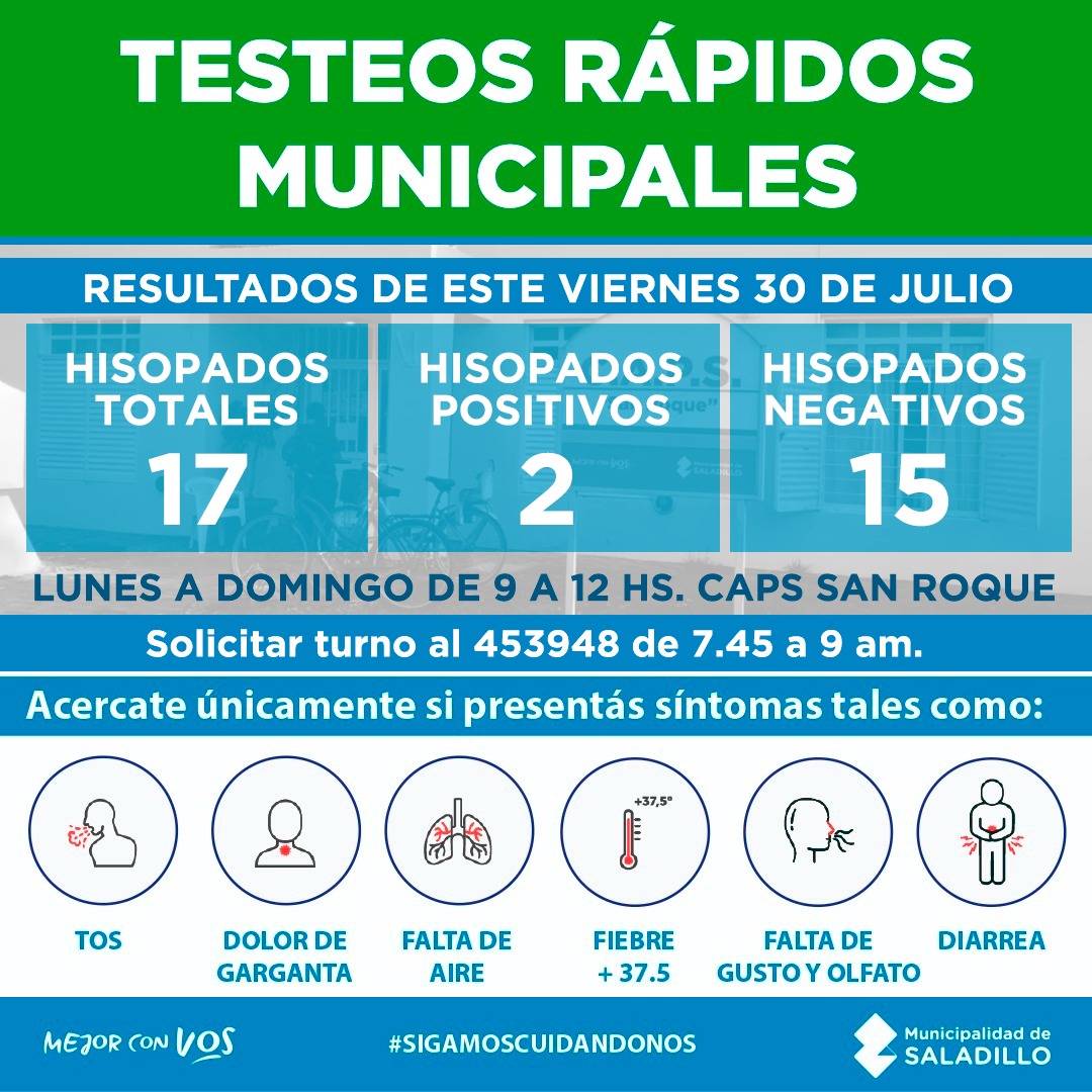 Información General Últimos resultados de la semana de los testeos rápidos julio 30, 2021 imagen ilustrativa - Publicidad - Resultados Testeos Rápidos Municipales Viernes 30-7-2021 Hisopados totales: 17 Hisopados positivos: 2 - Publicidad - Hisopados negativos: 15