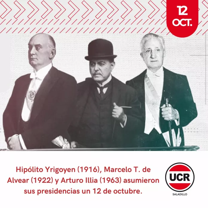 Un 12 de octubre asumieron tres grandes presidentes radicales: Hipólito Yrigoyen (1916), Marcelo T. de Alvear (1922) y Arturo Illia (1963). Tres hombres, una misma convicción: transformar la Argentina desde la democracia, la transparencia y la justicia social.A lo largo del tiempo, el radicalismo ha defendido los mismos valores que nos dieron identidad y futuro. Recordar es reafirmar nuestras raíces y mirar adelante con la fuerza de nuestra historia.
