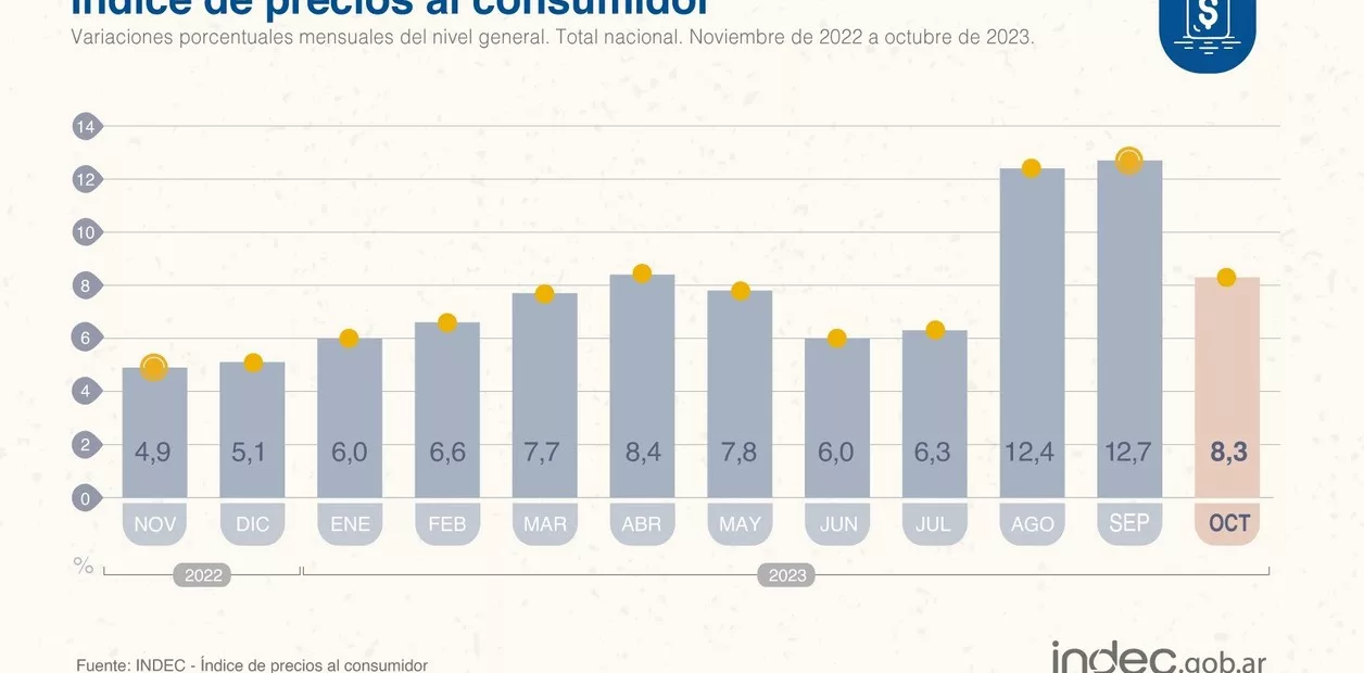 La inflación de octubre fue de 8,3%, según informó este lunes el Instituto Nacional de Estadística y Censos (Indec) en el último índice de inflación que difunde el organismo antes del balotaje presidencial del próximo domingo. De esta forma, acumula 142,7% en los últimos 12 meses, el mayor registro en los últimos 32 años. En lo que va de 2023, en tanto, el incremento acumulado es del 120%.