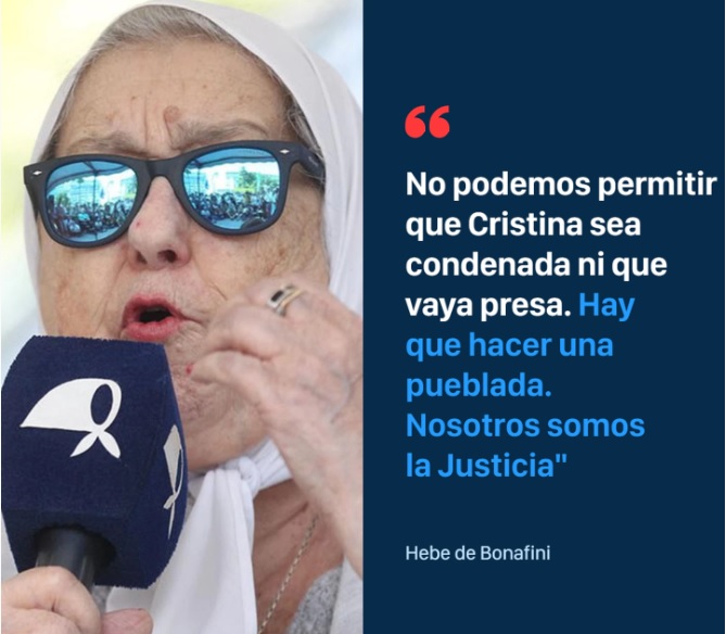 “No podemos permitir que Cristina sea condenada ni que vaya presa. Hay que hacer una pueblada, es lo único que le va a salvar. Hay que defenderla con todo. Nosotros somos la justicia”, afirmó Bonafini el pasado viernes.