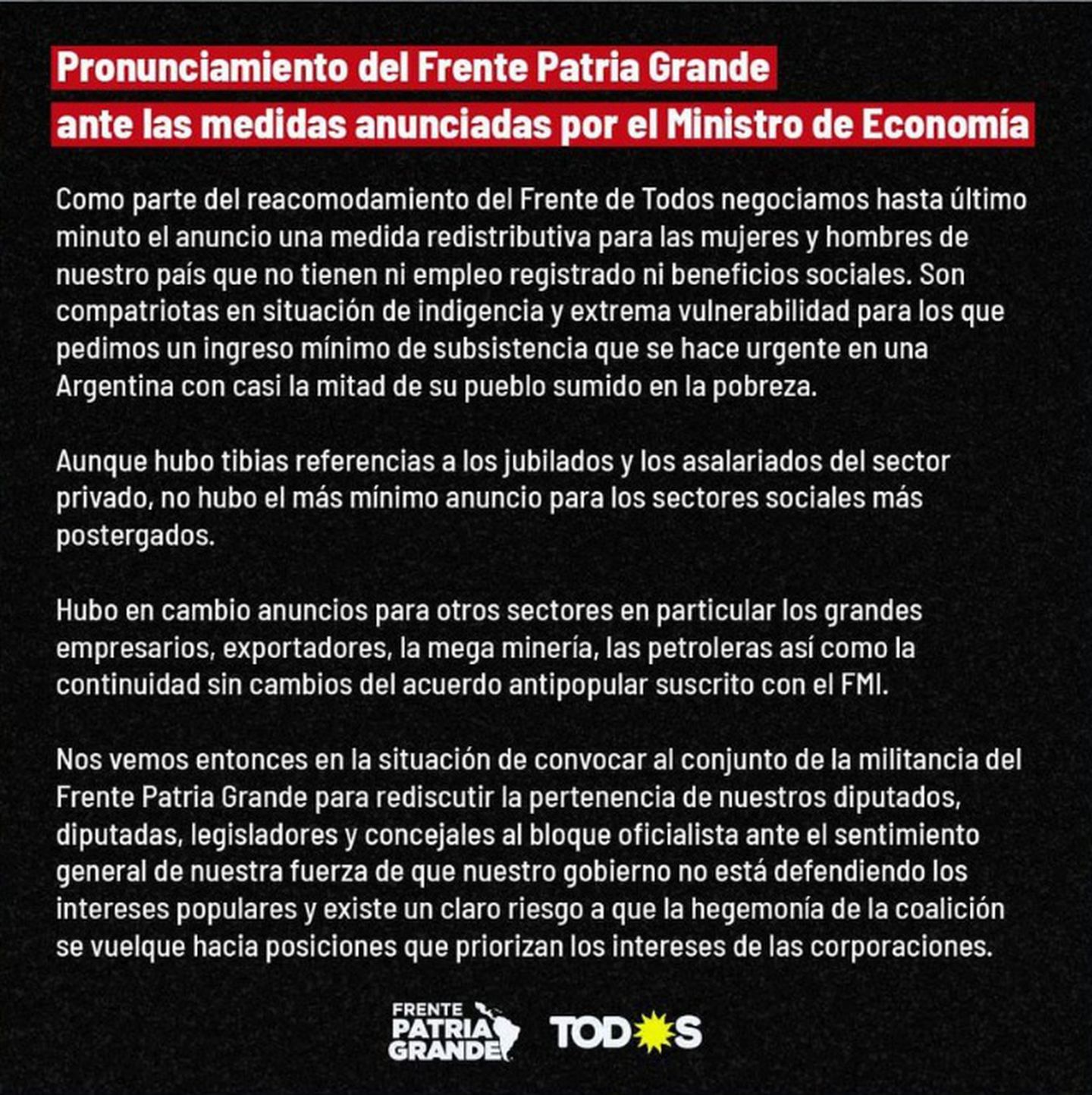 Bajo el título “Pronunciamiento del Frente Patria Grande ante las medidas anunciadas por el Ministerio de Economía”, el partido informó que negociaron infructuosamente “hasta último minuto el anuncio de una medida redistributiva” para los sectores más vulnerables de la población.