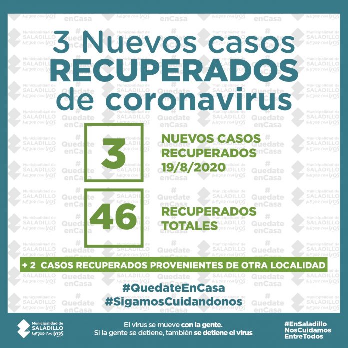 Saladillo 3 nuevos casos recuperados de coronavirus agosto 19, 2020 - Publicidad - 3 casos recuperados 19/08/202046 casos recuperados totales