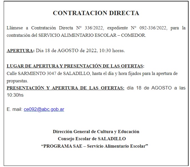 Llámese a Contratación Directa N° 336/2022, expediente N° 092-336/2022, para la contratación del SERVICIO ALIMENTARIO ESCOLAR – COMEDOR.