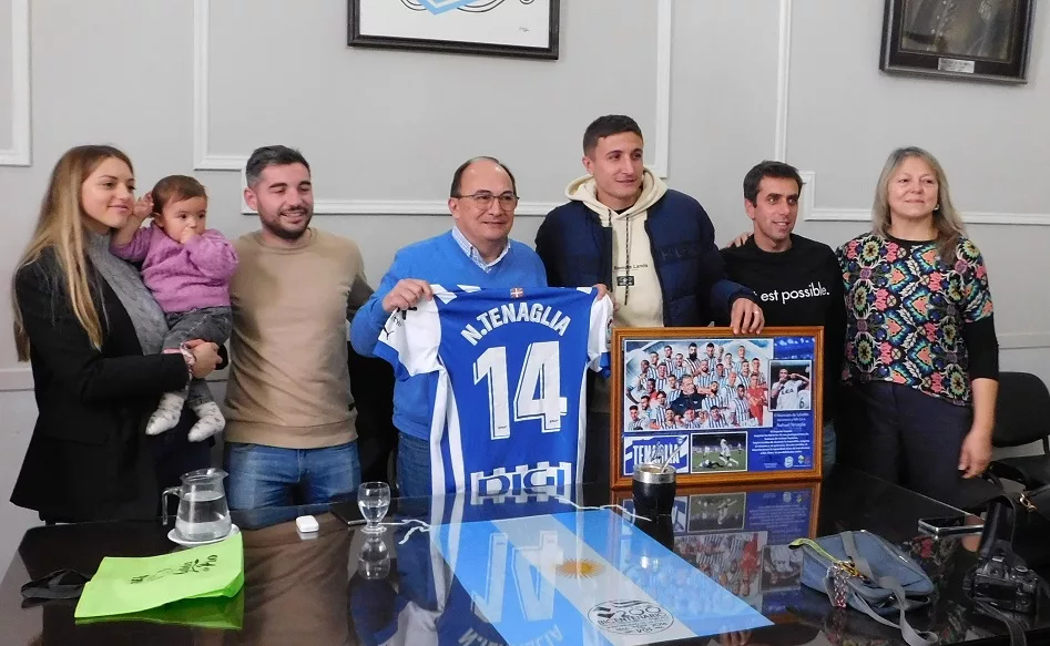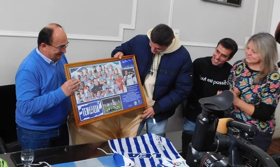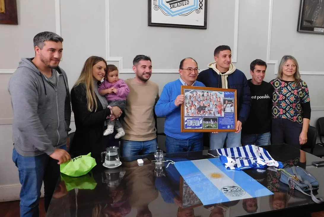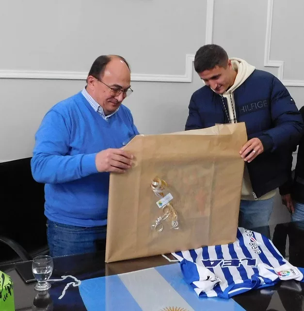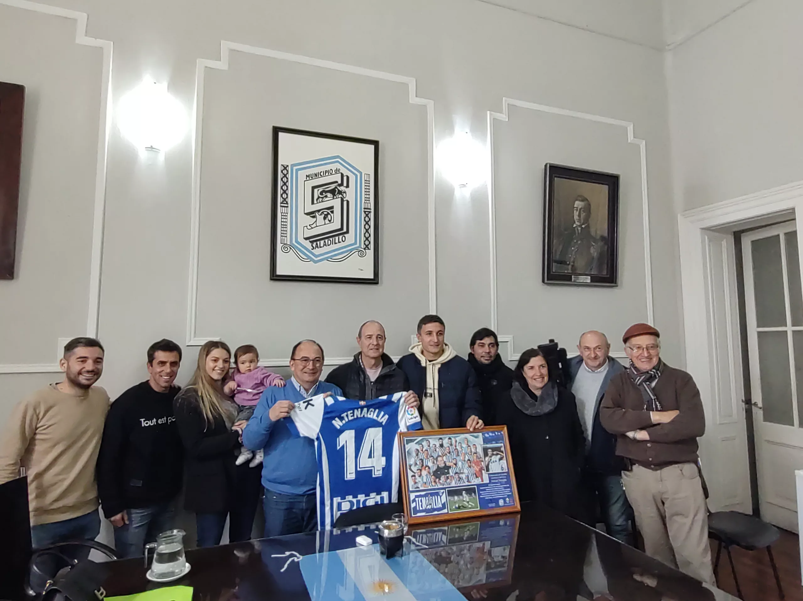 Ya en tiempo de festejos junto a su familia y en Argentina, más puntualmente en Saladillo, fue recibido este martes por el Intendente José Luis Salomón, junto a sus principales funcionarios, donde recibió algunos presentes e inclusive el Intendente recibió, además, la camiseta del Alaves.