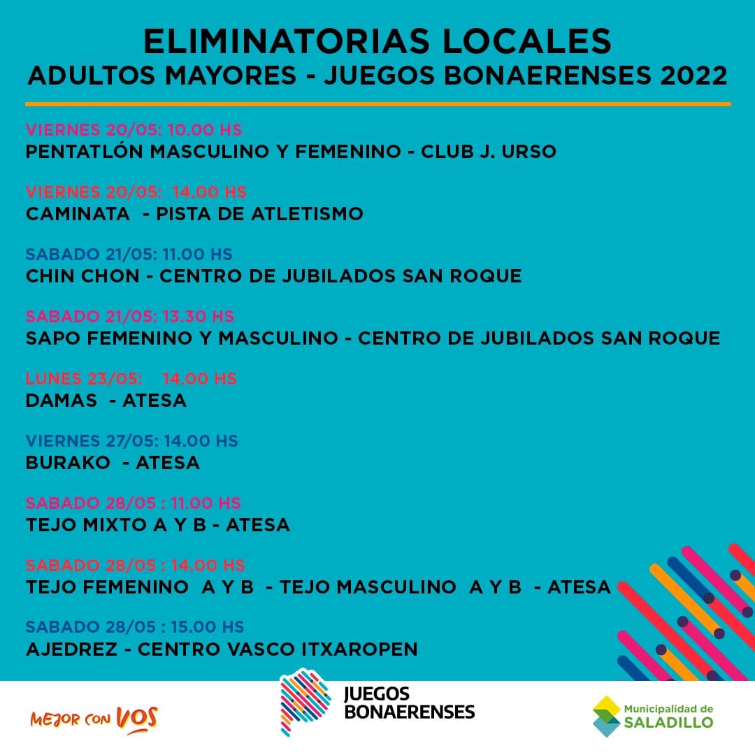 Eliminatorias locales adultos mayores. A partir de este viernes 20 de mayo comenzaran las eliminatorias locales de Adultos Mayores de los Juegos Bonaerenses 2022.Adjuntamos los distintos deportes que ya tienen su fecha y lugar de eliminatoria confirmada.