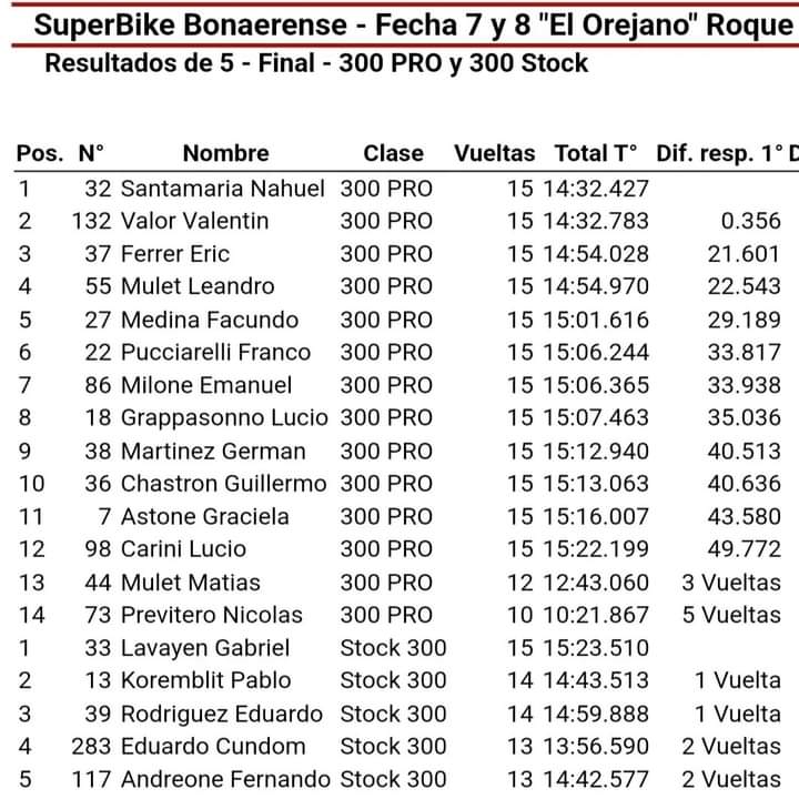 El joven piloto de Saladillo, Valentín Valor, cerrando un excelente año, fue segundo en su mejor actuación en la Pro 300 del Superbike Bonaerense en el circuito de Roque Pérez este domingo último. Valentín le dio lucha al ganador y solo quedó a 300 milésimas de Nahuel Santamarina (Misiones) al cruzar la bandera de cuadros.