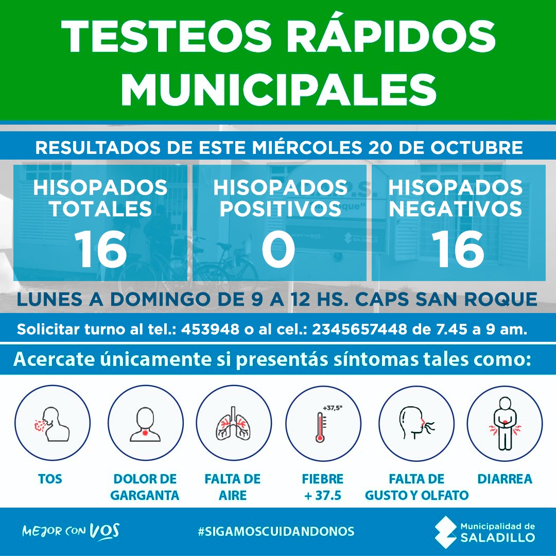 Saladillo Estadísticas de testeos rápidos octubre 20, 2021 - Publicidad - RESULTADOS TESTEOS RÁPIDOS MUNICIPALES Miércoles 20-10-2021 Hisopados totales: 16Hisopados positivos: 0Hisopados negativos: 16